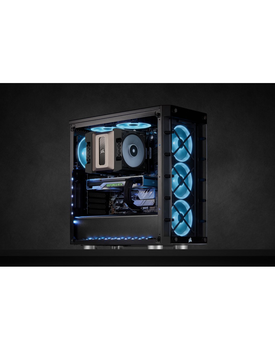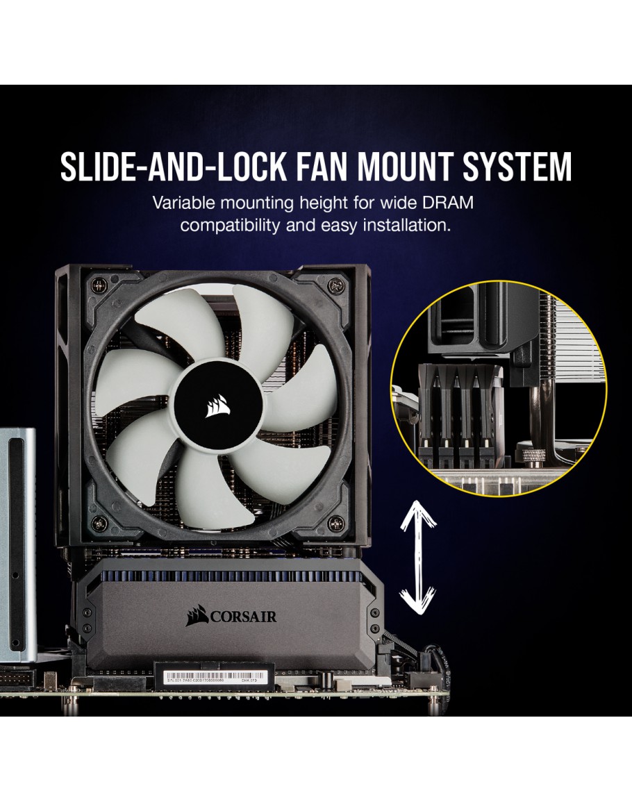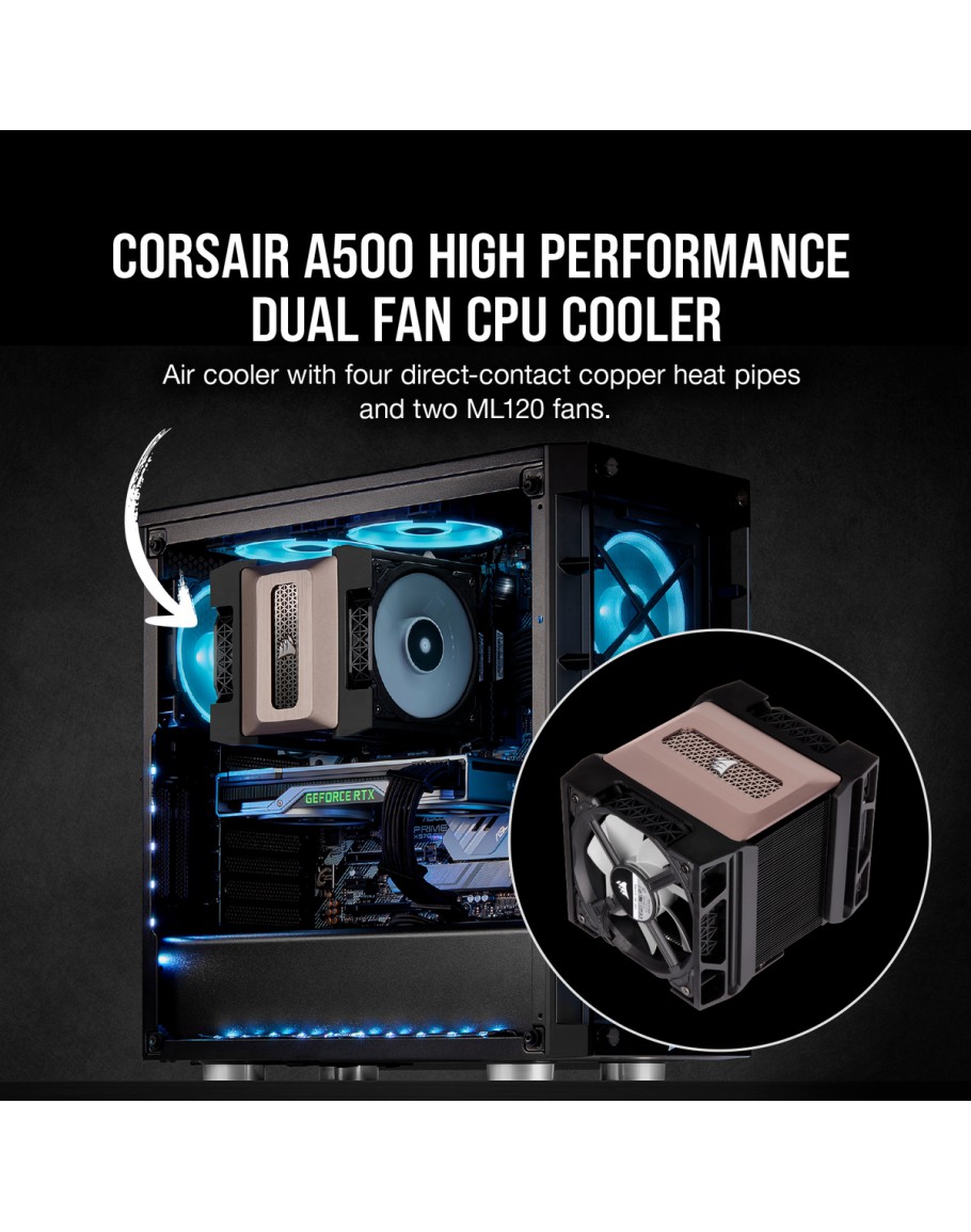 Features  A500 Dual Fan CPU Cooler, equipped with 4 x direct-contact copper heat pipes and 2 x Corsair ML120 fans, Variable mounting height for wide DRAM