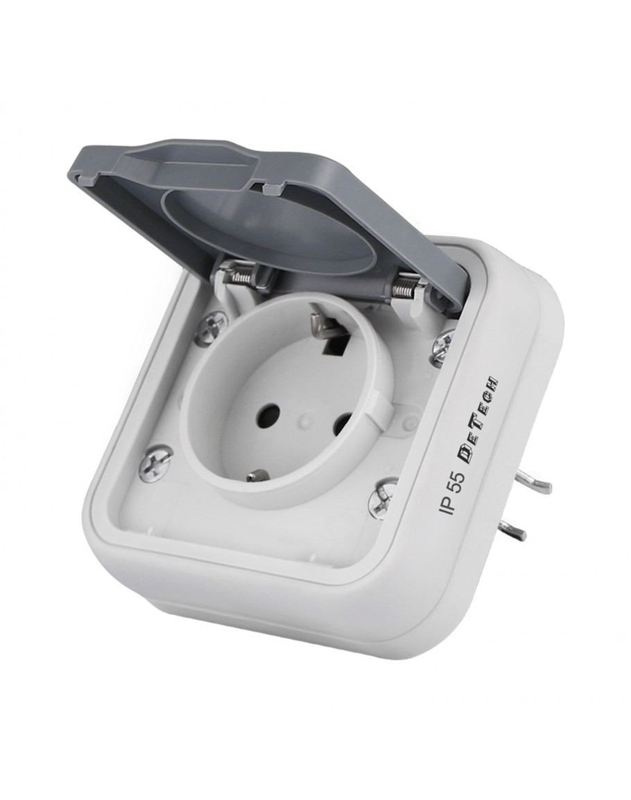 Единичен контакт тип „Шуко“ с напрежение 250V/ 16 A, предназначен за монтаж на открито или на влажни места, със степен на защита IP55. С бял корпус, изработен така че да осигурява защита срещу проникване на прах и пръски вода. Контакта е подходящ за външен монтаж или в зони, където има повишена влажност.