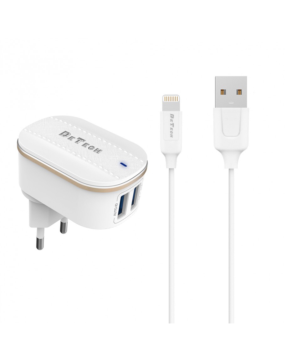 Мрежово зарядно устройство DeTech DE-15i, 5V/3.1A, 220V, 2 x USB, С Lightning кабел, 1.0m, Бял - 40097