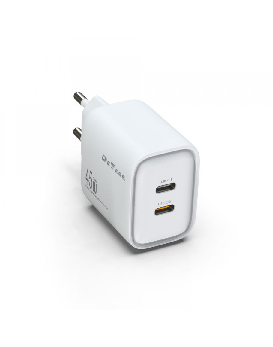 Мрежово зарядно устройство DeTech DE-PD, 65W, GaN, С Type-C - Type-C кабел, 2 x Type-C F, 1 x USB F, Бял - 40343