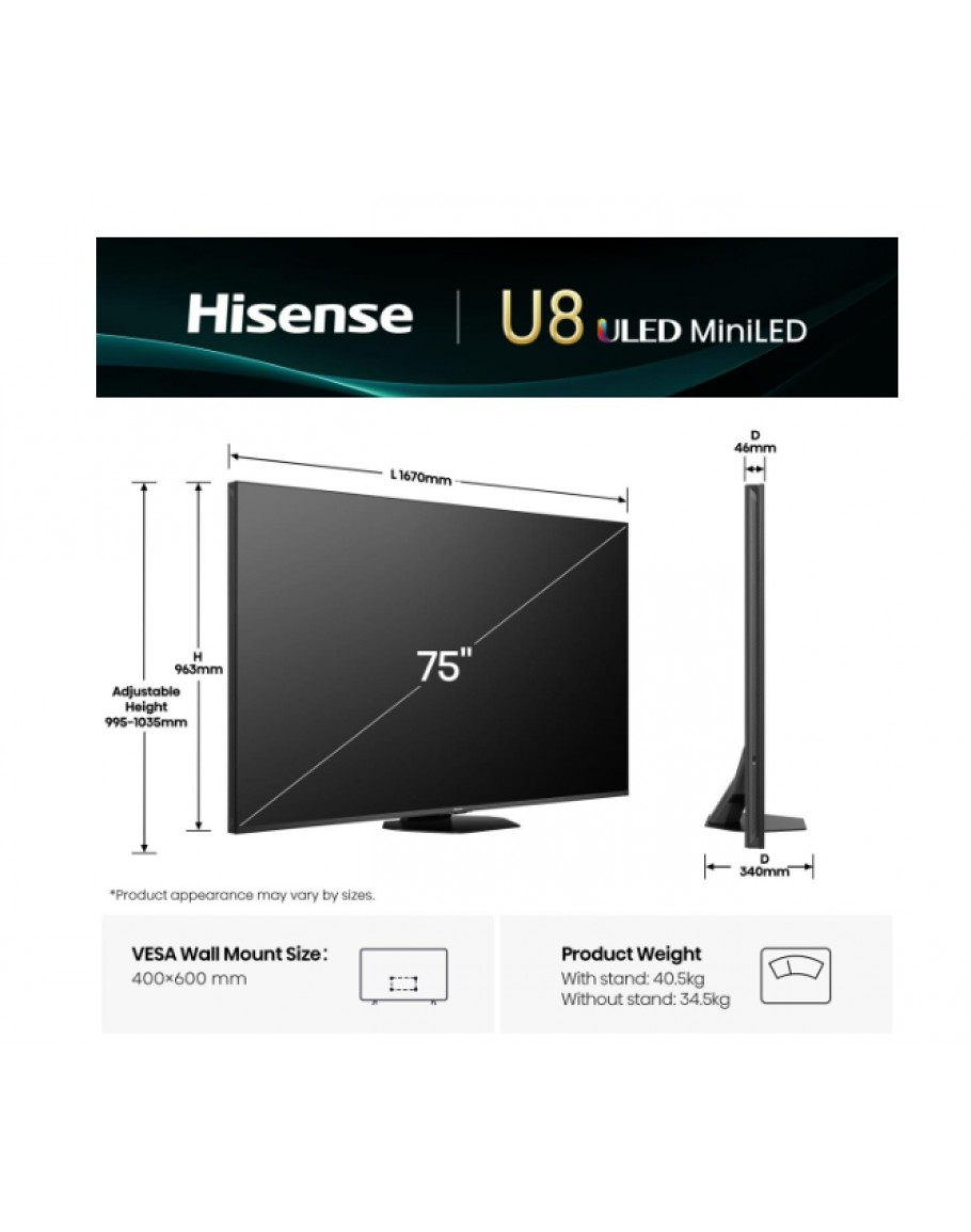 Hisense 75 U8Q, 4K Ultra HD 3840x2160, Mini Led Pr