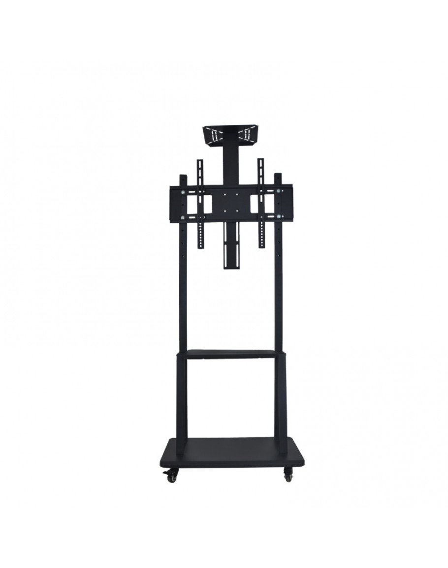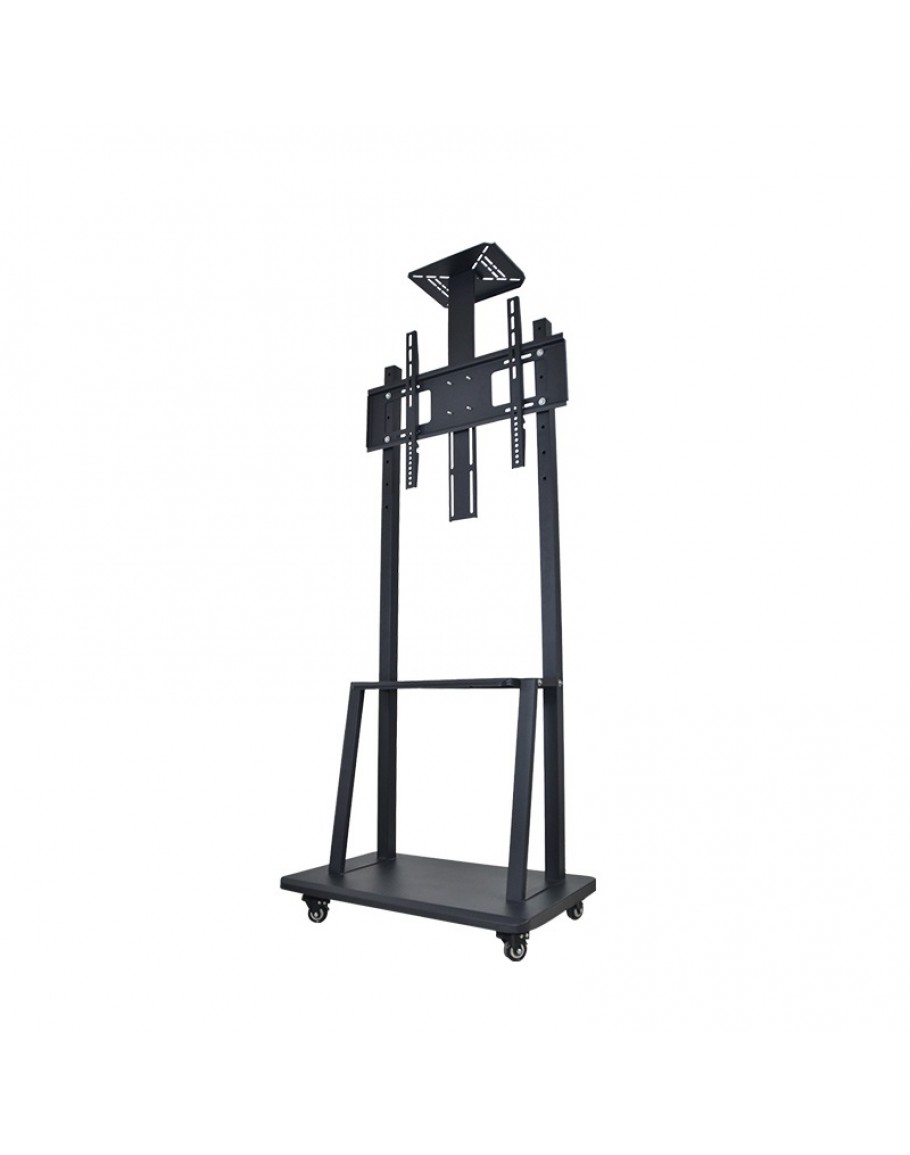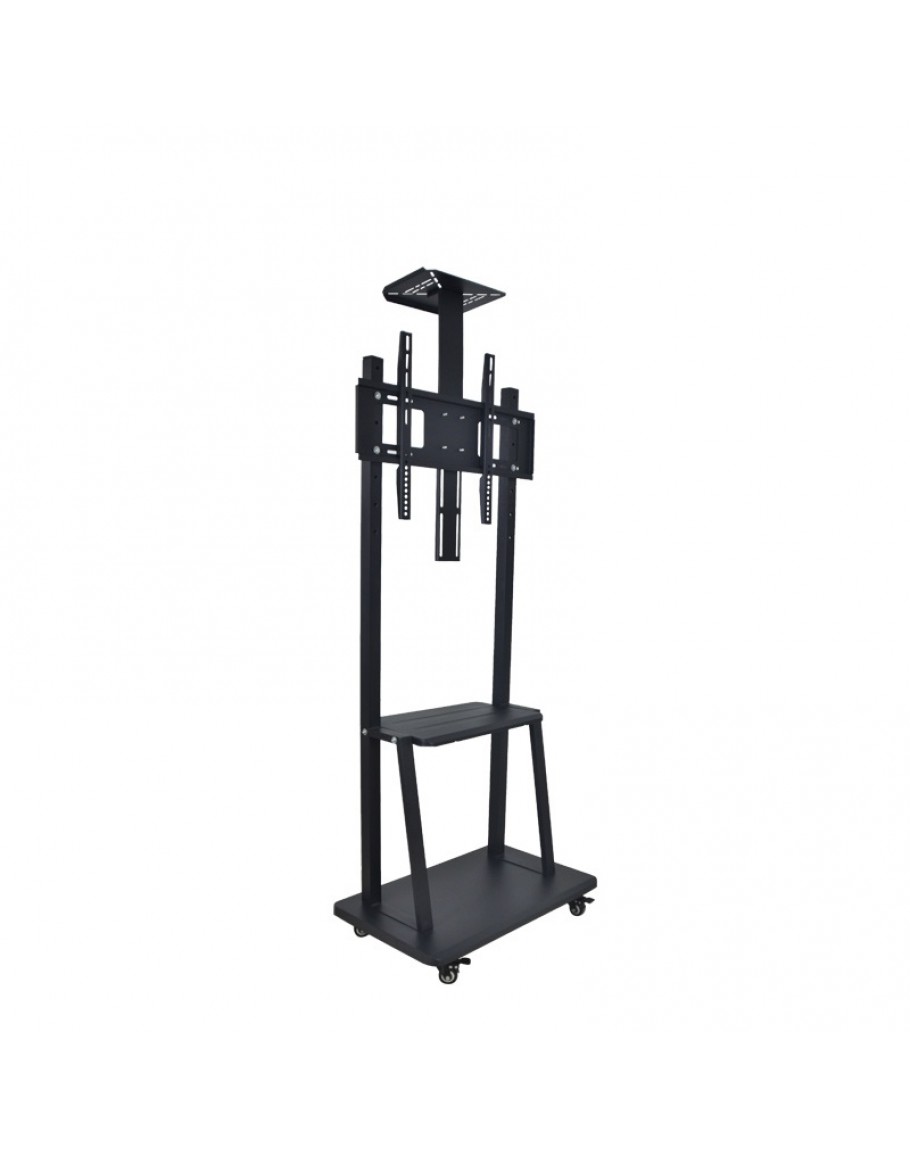 Фиксирана стойка за телевизор за подов монтаж, подходяща за екрани до 65 инча. Здрава и стабилна конструкция в черен цвят, осигурява сигурно позициониране без нужда от монтаж на стена или таван. Идеална за различни помещения.